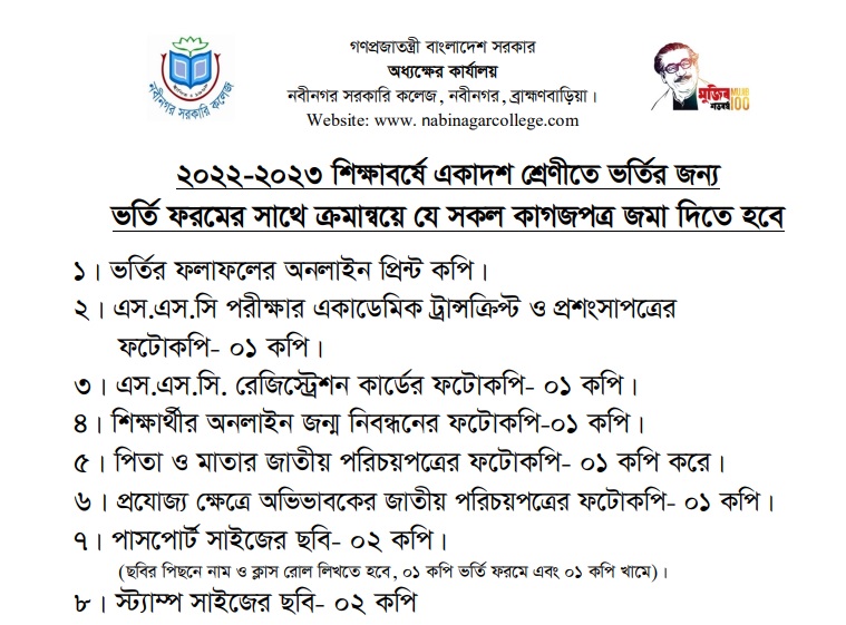 ২০২২-২০২৩ শিক্ষাবর্ষে একাদশ শ্রেণীতে ভর্তির জন্য প্রয়োজনীয় কাগজপত্রNotices / January 19, 2023 ২০২২-২০২৩ শিক্ষাবর্ষে একাদশ শ্রেণীতে ভর্তির জন্য প্রয়োজনীয় কাগজপত্রসমূহের তালিকাHSC-AdmDownload